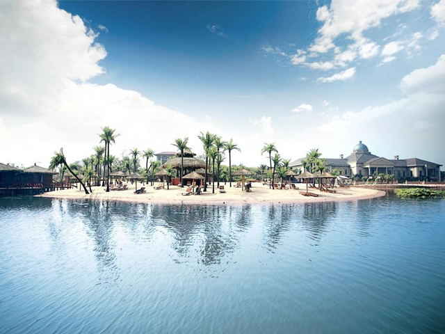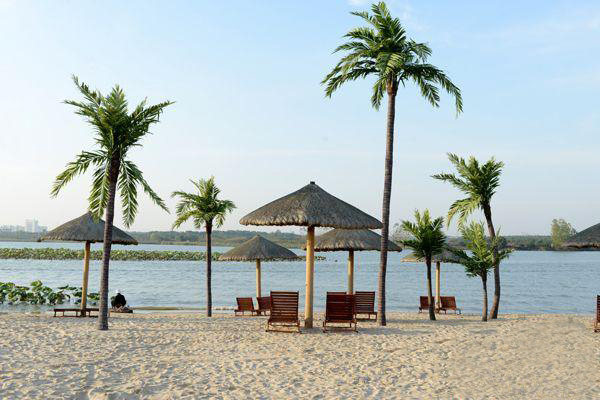 比如我們松濤工藝的特色案例——武漢世貿龍灣仿真椰子林,就是受當地開發商的邀請,在當地一個三面環水的小島上打造出一個世茂龍灣——馬爾代夫風情沙灘。該項目充分展現生態人居的理念,我們松濤工藝在設計、施工的過程中注重把美學藝術和實用性融入施工環境,在塑造完美景觀的基礎上保障經久耐看和使用壽命更長。所以我們公司所采用的椰子樹材料就有所不同,我們用鋼結構貫穿樹桿內部,底部加牢固定有鋼板和爆炸螺絲,可抗十級以上臺風。在塑造椰子樹橫臥水面狀態下的自然風景時,更是表現出松濤工藝不凡的設計和施工能力,一般傳統同行基本難以完成這類景觀藝術化的制作。