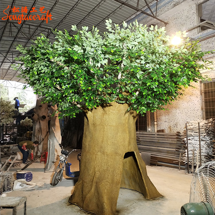仿真榕樹主要有玻璃鋼、PE塑料、鍍鋅鋼等環保材料制作。根據仿真榕樹不同的造型大小和不同的場所使用的材料也有些不同。仿真榕樹最高可達30米,可向四面無限伸展。其支柱根和枝干交織在一起,形似稠密的叢林,因此被稱為“獨木成林”。仿真榕樹主要應用于園林綠化,室內仿真榕樹也普及存在。